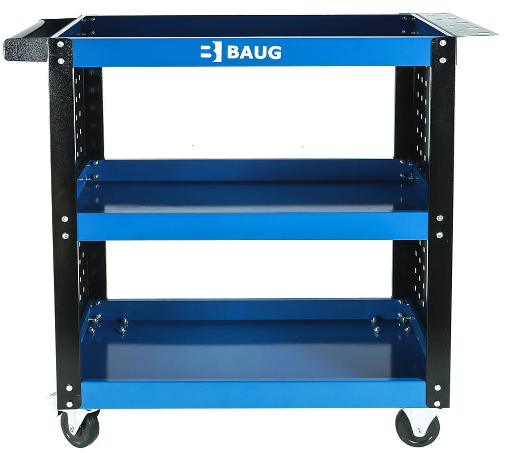 Căruciorul este prevăzut cu 3 rafturi spațioase, care oferă suficient loc pentru depozitarea și organizarea echipamentelor. Marginile ridicate ale rafturilor ajută la prevenirea alunecării obiectelor în timpul deplasării.